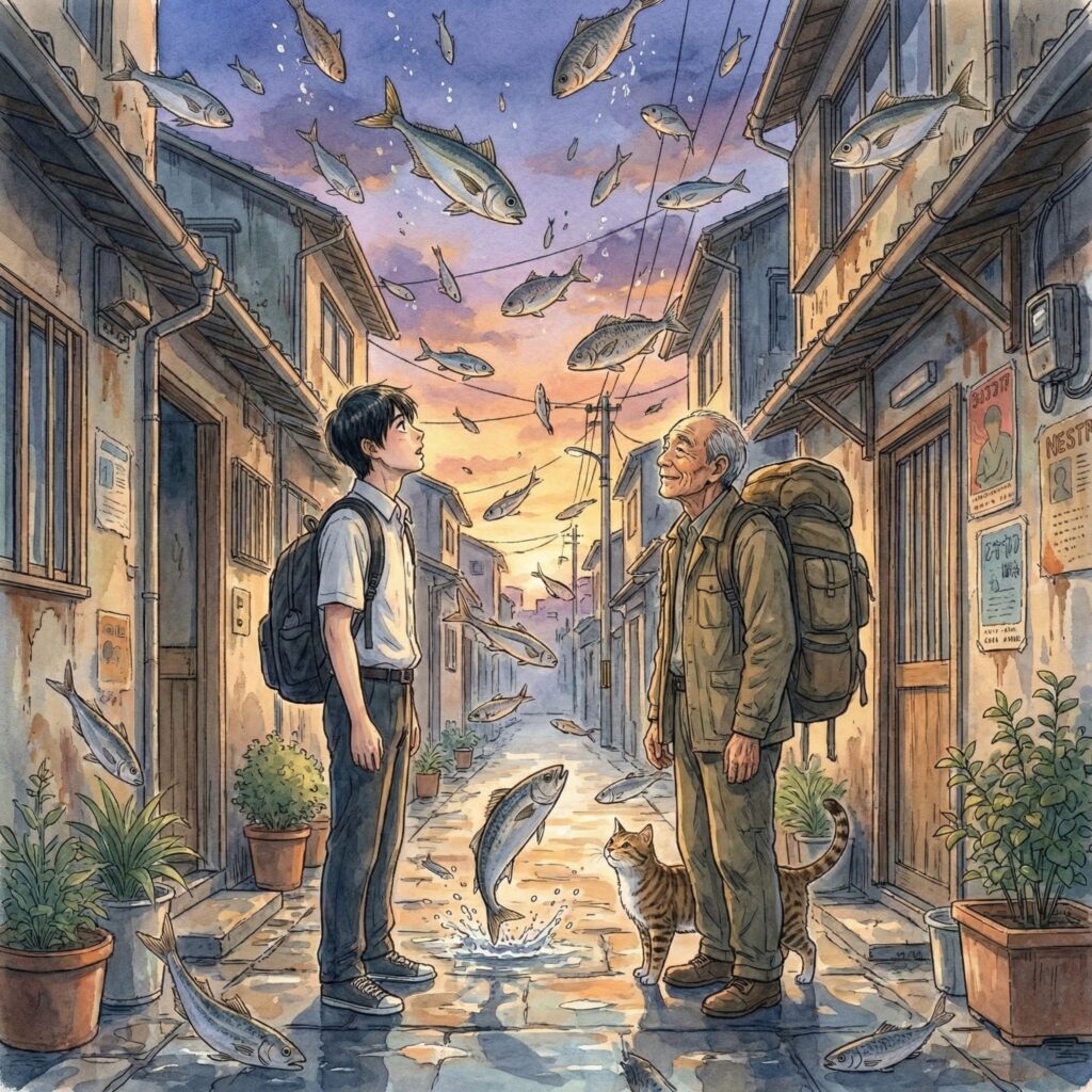 家出した少年と、旅に出た老人。 年齢も目的も全く違う2人の物語は、空から「魚」が降ってくるような非現実的な現象と共に、少しずつ、しかし確実に一つに繋がっていきます。